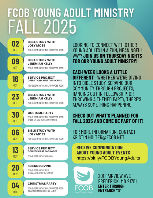 The FCOB Young Adult ministry is there for you. We can do life together, have a good time, and have some good conversations about where you're going and where He is leading you.