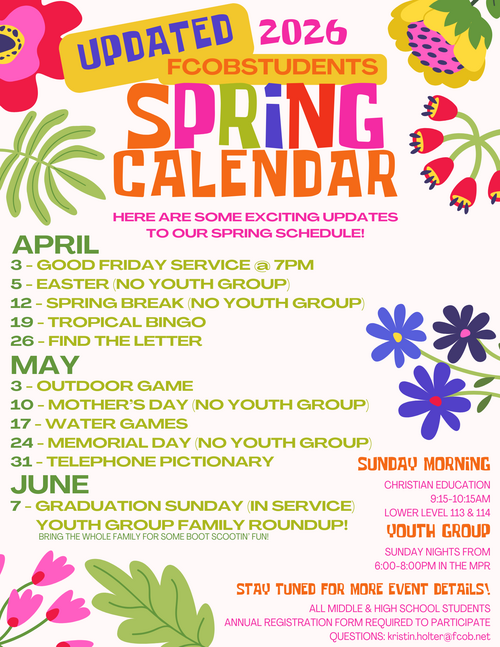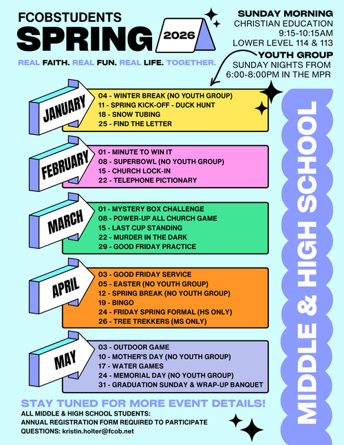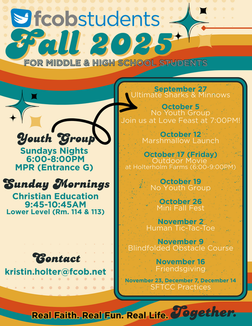 Sunday Nights is our version of youth group that meets during the school year. It is for middle and high school youth. Sunday Nights is not something you just go to. You experience it... it is how we at FCOB get you encouraged and ready for the week ahead! Fun, games, snacks, and plenty of laughs are sure to be had.